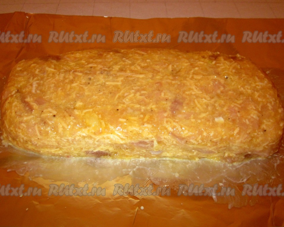 Полученную сырно-мясную массу тщательно перемешать и выложить на фольгу, формируя смоченными в воде руками хлебушек.