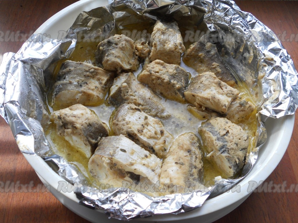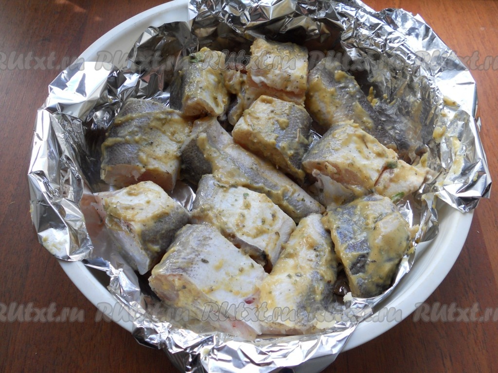 Рыбу нарезать кусочками (я готовила с костями, можно использовать рыбное филе). Смазать кусочки рыбы подготовленной горчичной смесью, выложить их в контейнер для готовки на пару, застеленный фольгой. Влить немного растительного масла.