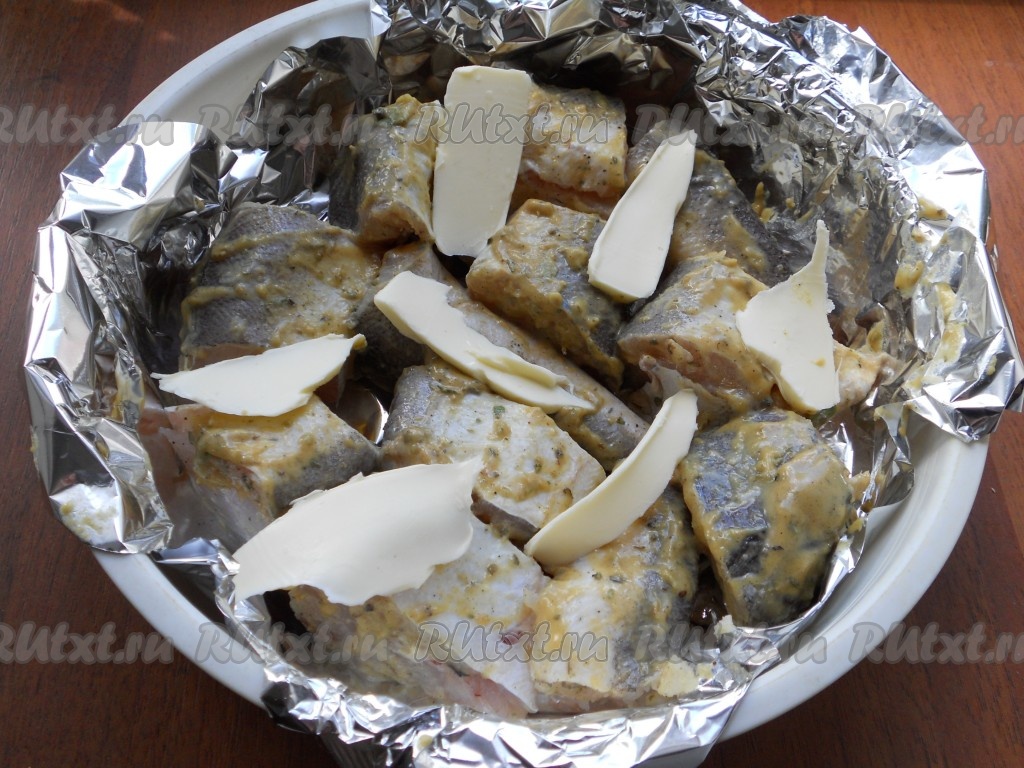 Кусочки рыбы должны быть уложены плотно друг к другу. На рыбу выложить кусочки сливочного масла.