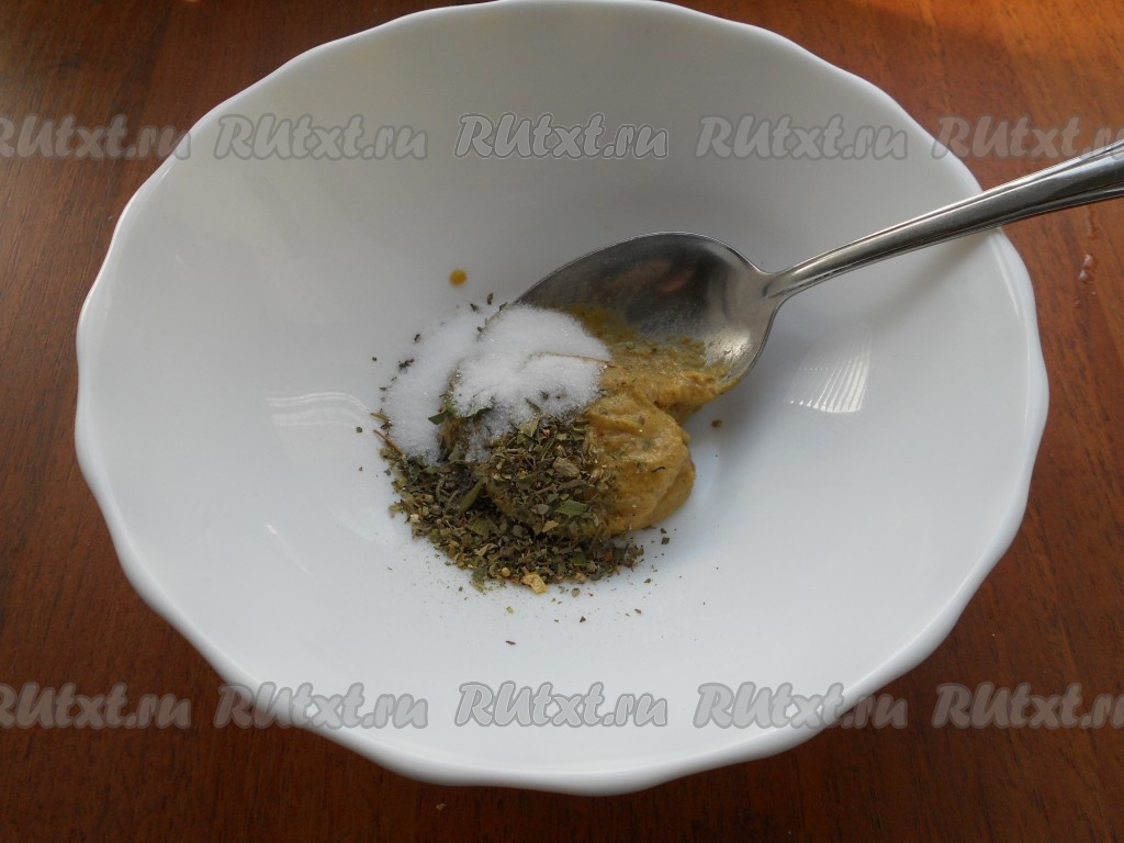 К горчице добавить соль и ароматные сухие травы (можно укроп, петрушку, тимьян), перемешать.