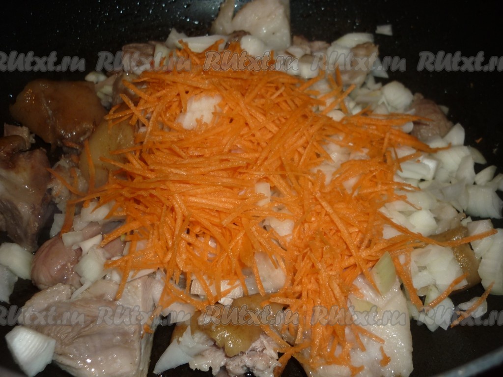 Лук и морковь очистить. Лук нарезать кубиками, морковь натереть на тёрке, добавить овощи к кусочкам свиной рульки и, помешивая, жарить 5 минут, затем посыпать чёрным молотым перцем.