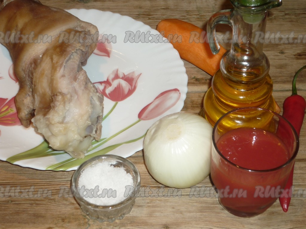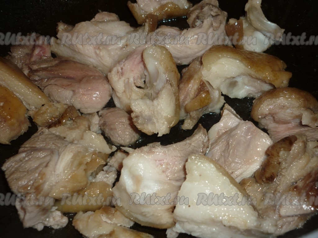 Свиную рульку хорошо помыть и отварить в подсоленной воде в течение 1 часа. Затем немного остудить и, отделив от кости, нарезать на порционные кусочки. На разогретой с растительным маслом сковороде обжарить кусочки мяса до румяной корочки со всех сторон, примерно 5-7 минут.