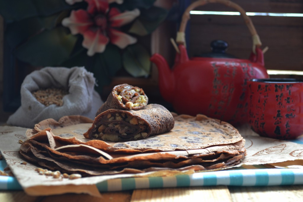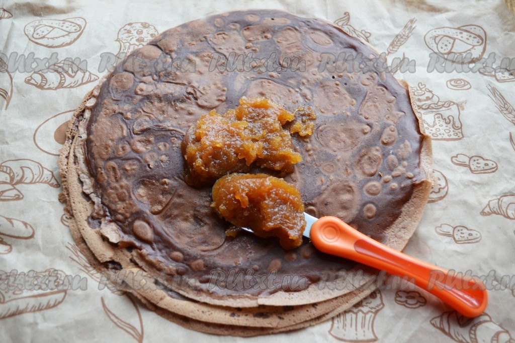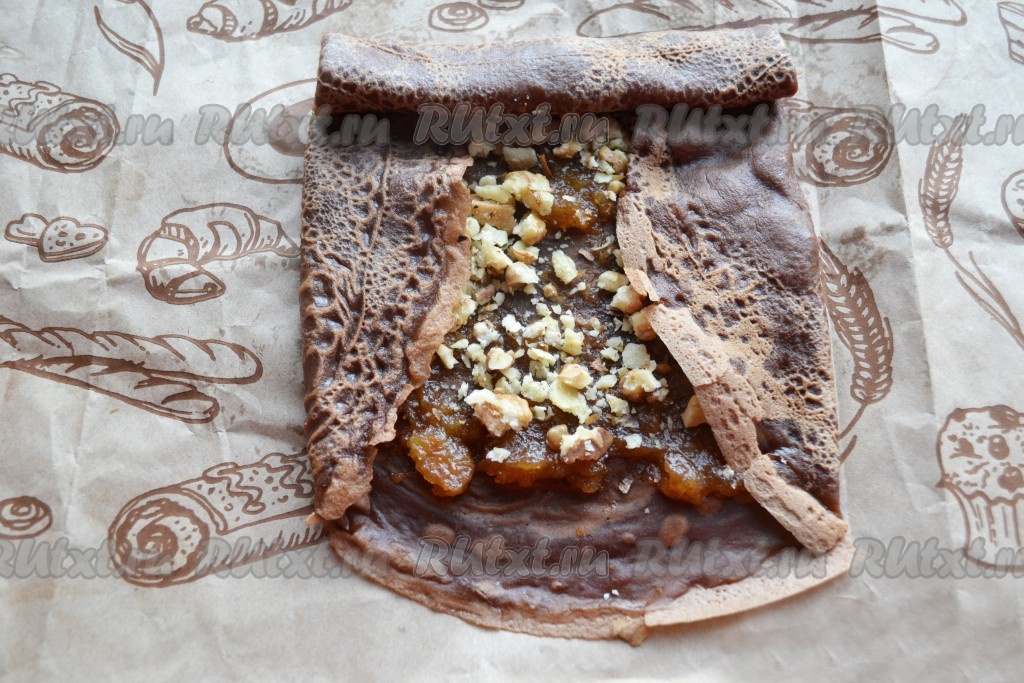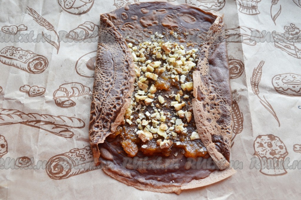 Вкусные шоколадные блины, замешанные на воде, уже готовы к употреблению. А я предпочитаю подавать их с начинкой, которая варьируется по настроению: мёд, сгущённое молоко, сироп. Сегодня захотелось смазать яблочный джемом, смешанным с грецкими орехами.