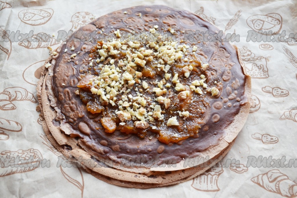 Для того чтобы орехи раскрыли свой богатый вкус и аромат, необходимо их заранее в течение 10 минут подсушить в духовке, разогретой до 180 градусов. 1-2 раза во время сушки орешки необходимо перемешать. Важно не пересушить, чтобы в орешках осталось немного влаги (пересушенные орехи могут горчить). Яблочный джем равномерно распределить по блину, оставляя края чистыми. Остывшие орехи немного растолочь и посыпать ими джем, которым смазывались шоколадные блины.