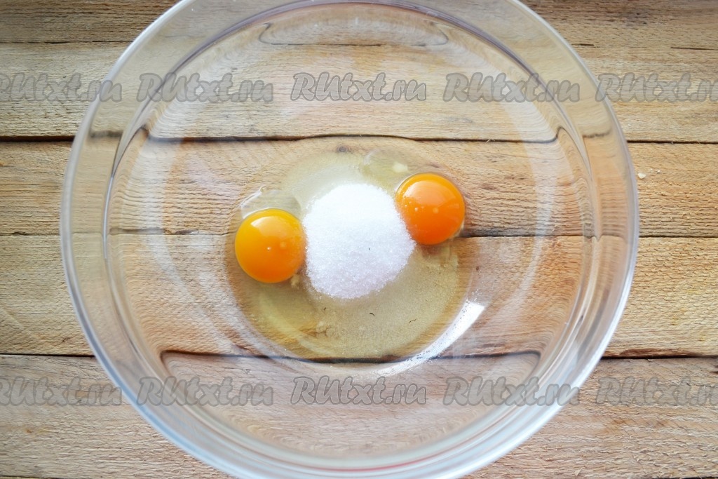 В глубокую миску вбиваем свежие куриные яйца комнатной температуры, всыпаем сахар.