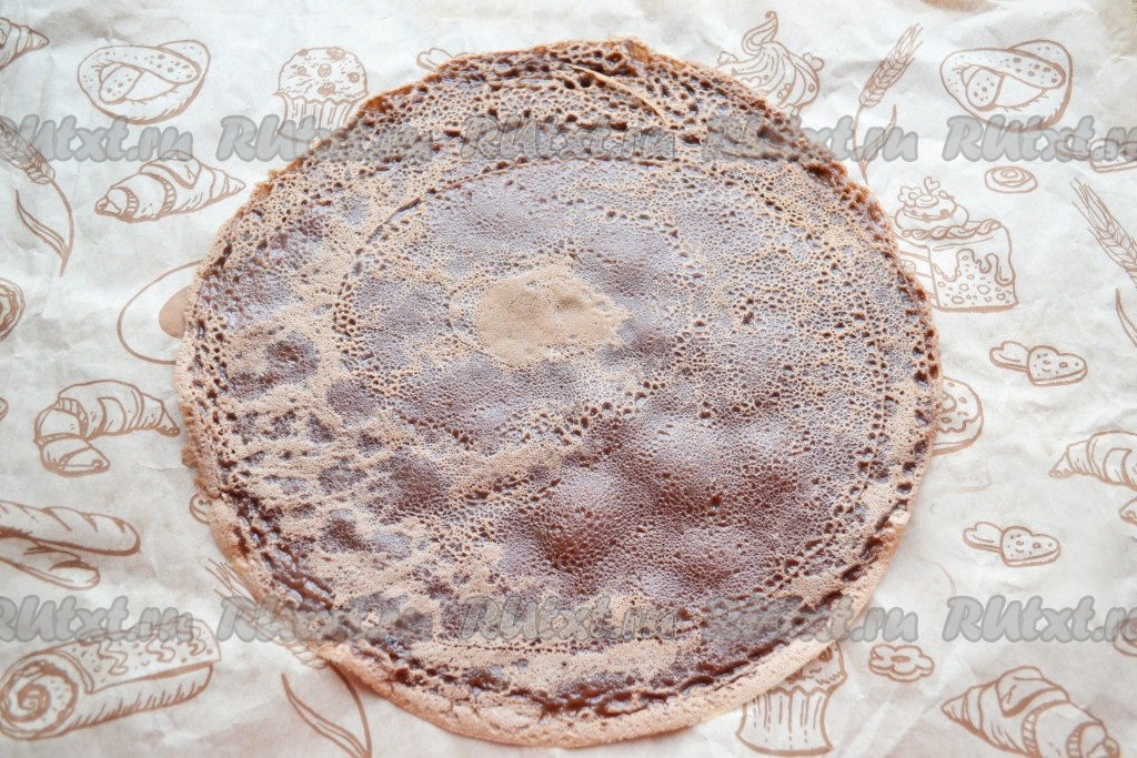 Перед тем как наливать тесто перед жаркой первого блина в сковороду, необходимо сковородку, смазанную маслом, хорошо разогреть (минуту подержать на среднем огне). Затем с помощью половника налить на разогретую сковороду часть теста. Наливая тесто в сковороду, поворачивайте сковороду в воздухе небольшими круговыми движеньями, чтобы тесто равномерно распределилось. Жарить каждый шоколадный блинчик с обеих сторон на среднем огне около двух минут, затем перекладывать на тарелку.