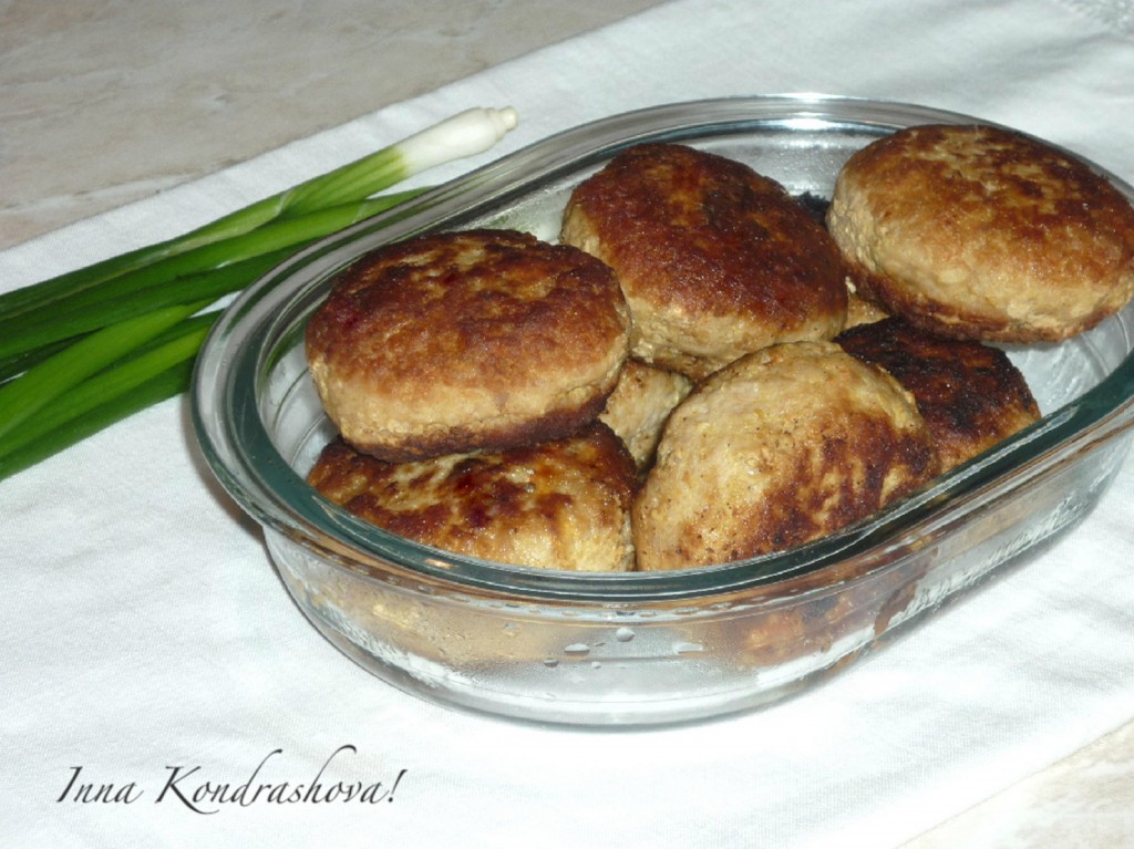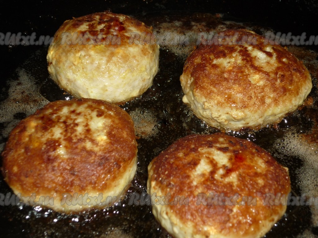 Обжарить котлетки с двух сторон до золотистой корочки (по 3-4 минуты с каждой стороны). Затем готовые котлеты сложить в кастрюлю, влить немного воды, накрыть крышкой и потушить 5-7 минут.