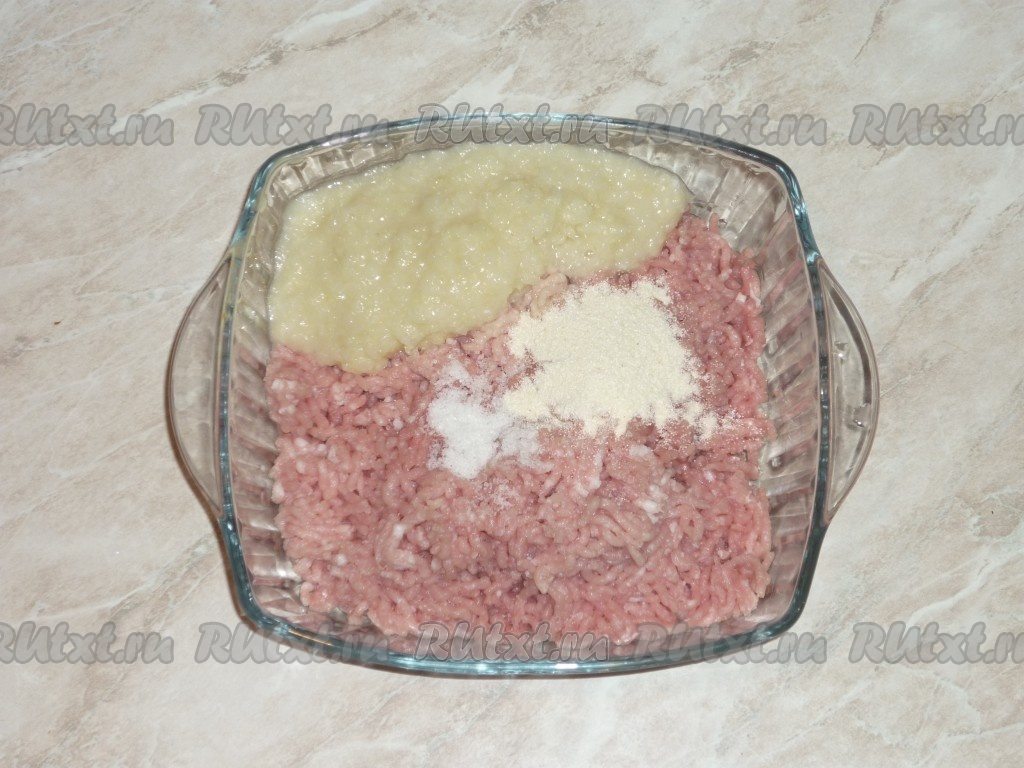 Картофель и лук очистить и, пропустив через мясорубку, добавить к фаршу. Всыпать манку, соль, перец и хорошо перемешать.