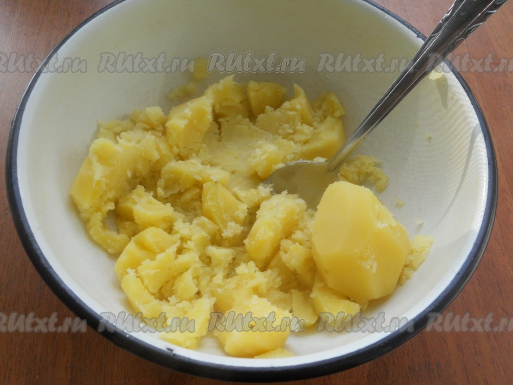 Когда картофель будет готов, вынуть его и растолочь. Влить немного бульона, перемешать и отставить картофель в сторону.