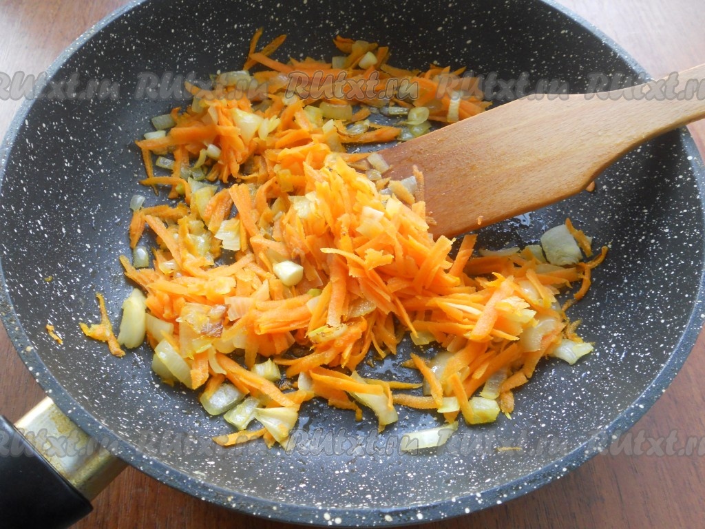 Вторую луковицу и целую морковь очистить, лук нарезать кубиками, морковь натереть на крупной терке. Обжарить овощи на растительном масле, помешивая, до мягкости.