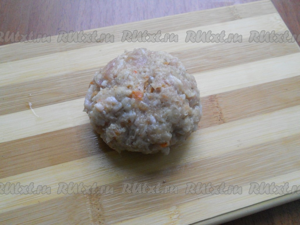Сформировать круглую крупную тефтелю, спрятав капусту внутри.