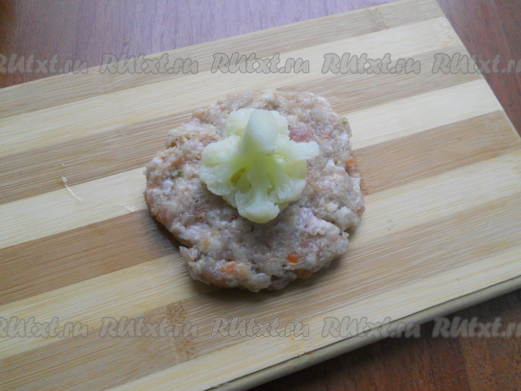 Из части фарша сделать лепёшку, внутрь поместить соцветие цветной капусты.