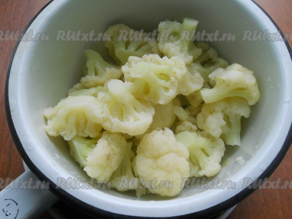 Цветную капусту разобрать на соцветия, поместить в кастрюлю, залить холодной водой и поставить на огонь, после закипания воды, уменьшив огонь, варить в течение 3-4 минут. Воду слить, капусту остудить.