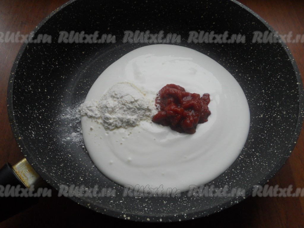 В холодную сковороду выложить сметану, добавить 1 столовую ложку муки и томатную пасту.