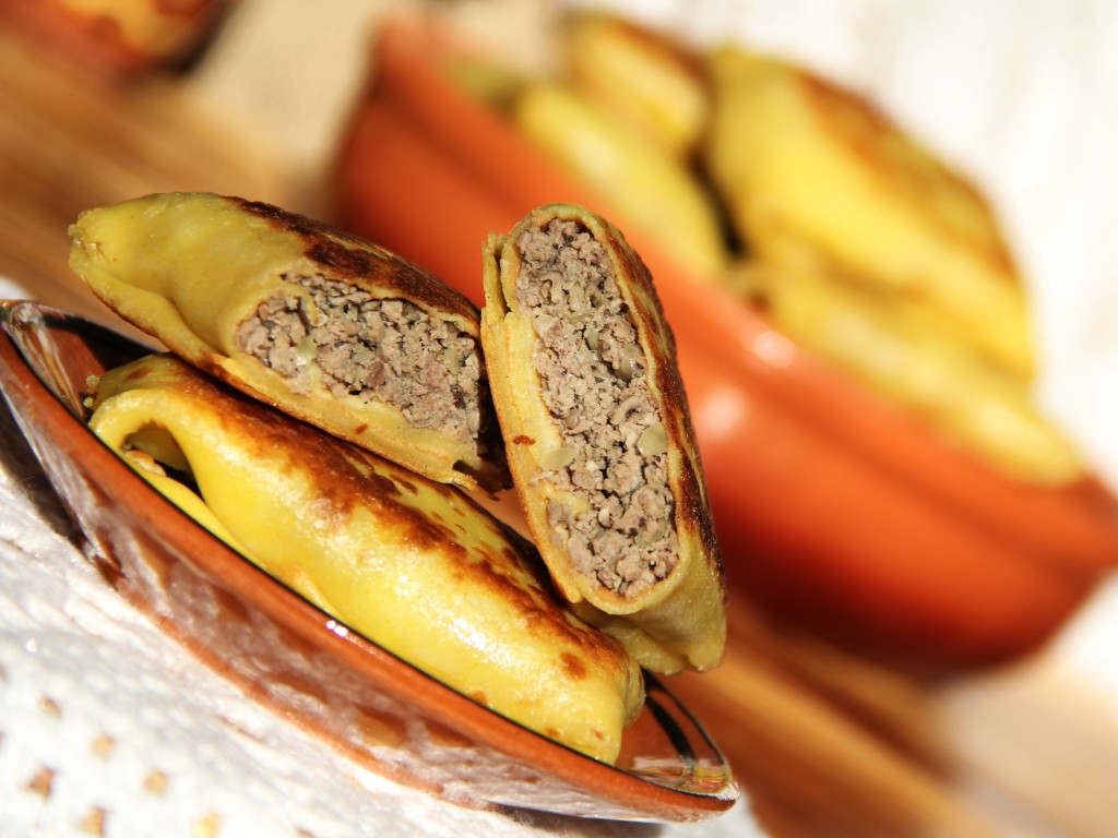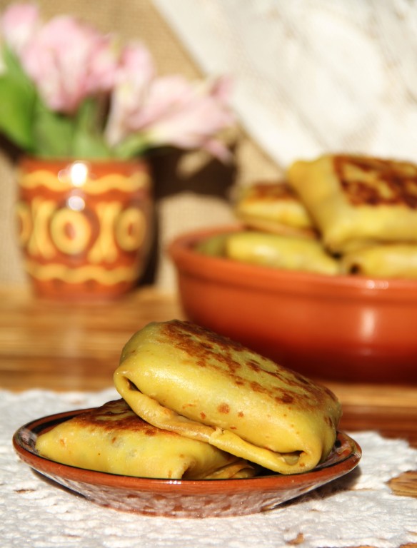 Подать блинчики с начинкой из куриных сердечек к столу в горячем виде. Можно сдобрить блины сметанкой или полить растопленным сливочным маслом.
