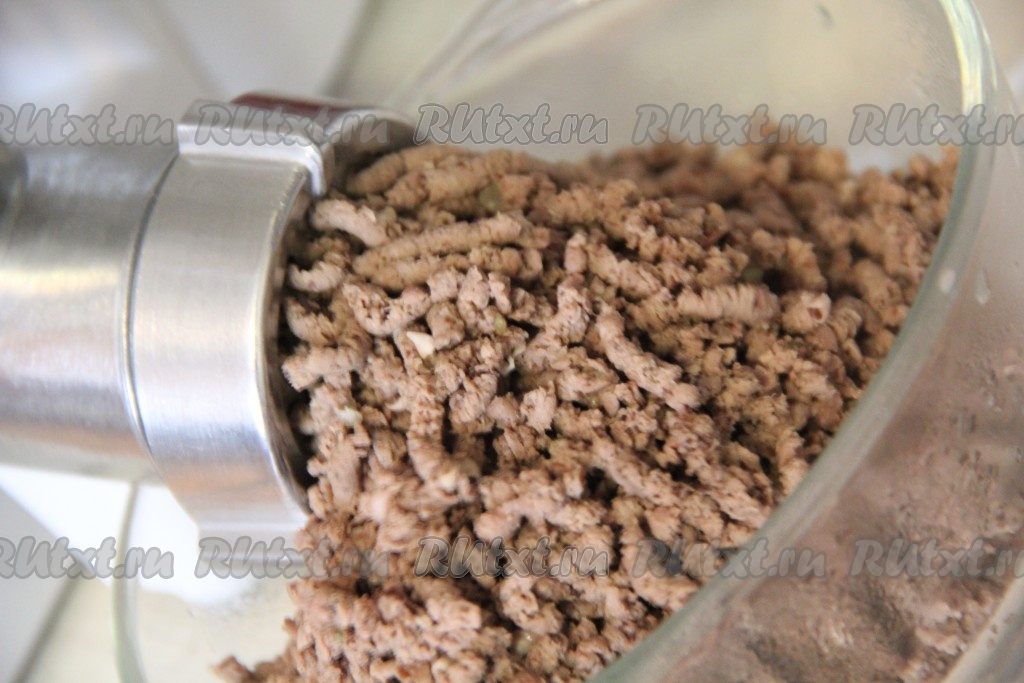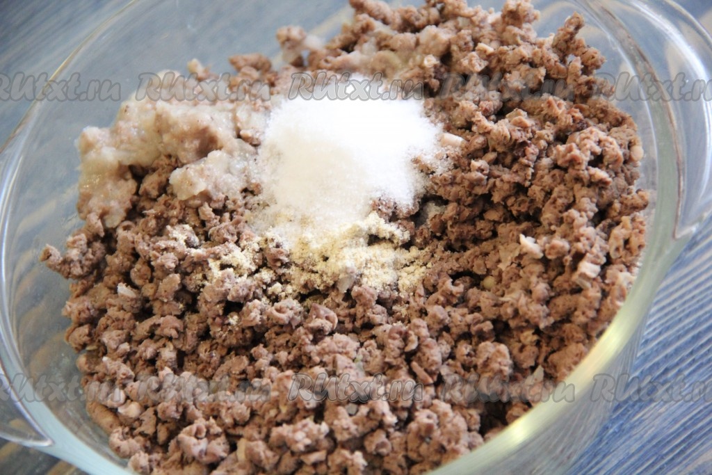Добавить в фарш из куриных сердечек соль и перец. Всё тщательно перемешать. Начинка для блинчиков готова!