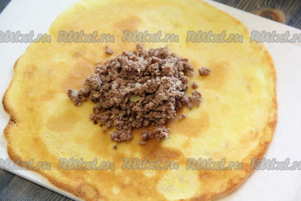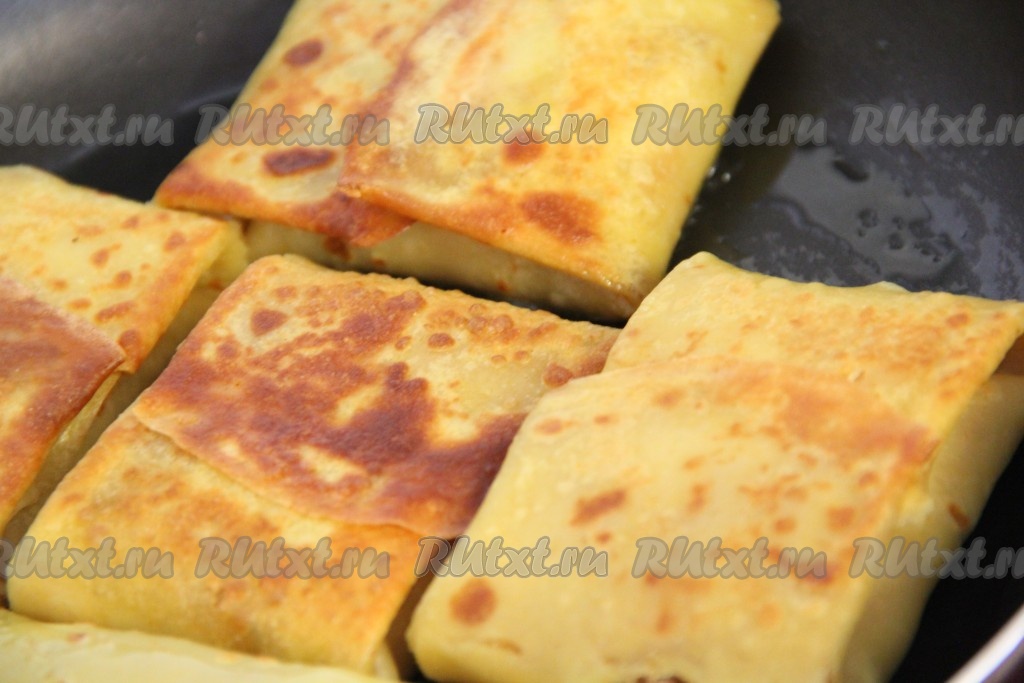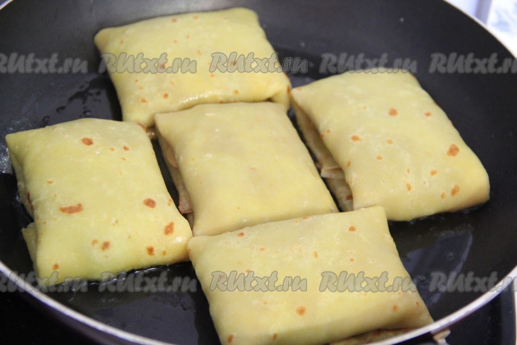 В сковороду влить немного растительного масла и поставить на огонь. Выложить блины с начинкой в сковороду.