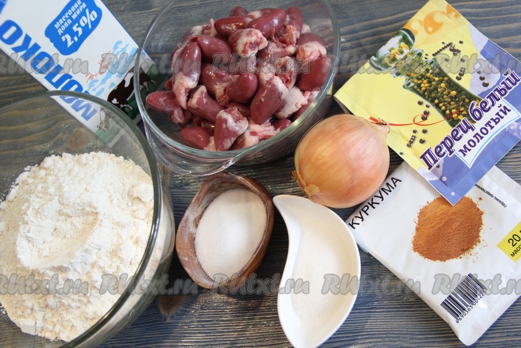 Подготовить продукты для блинчиков с начинкой из куриных сердечек.
