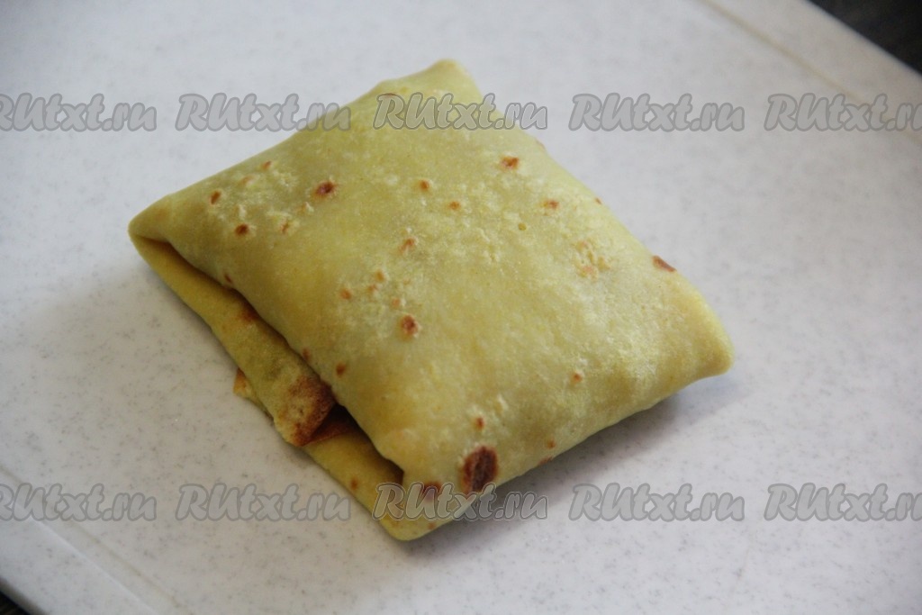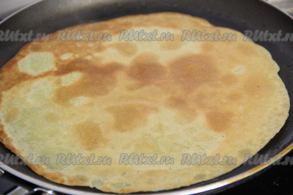 Выпекать блинчики на раскалённой сковороде с двух сторон до золотистого цвета (перед выпеканием первого блина сковороду можно смазать растительным маслом). Аппетитные, вкусные блины можно с пылу с жару подавать с вареньем или сметаной к столу или продолжить приготовление, завернув в них начинку из куриных сердечек.