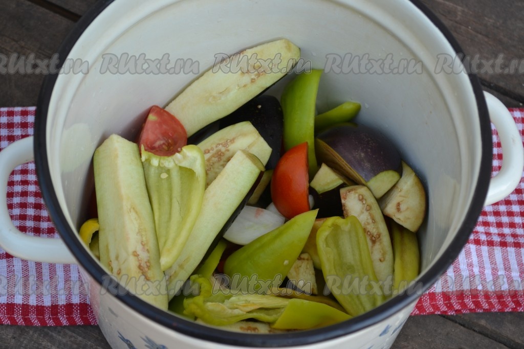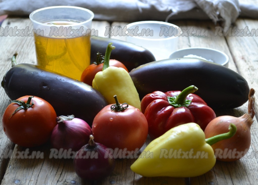 Лук очистить. У баклажанов и помидоров удалить хвостики. Болгарский перец очистить от семян. Помидоры, лук, баклажаны и перцы разрезать на 4 части.