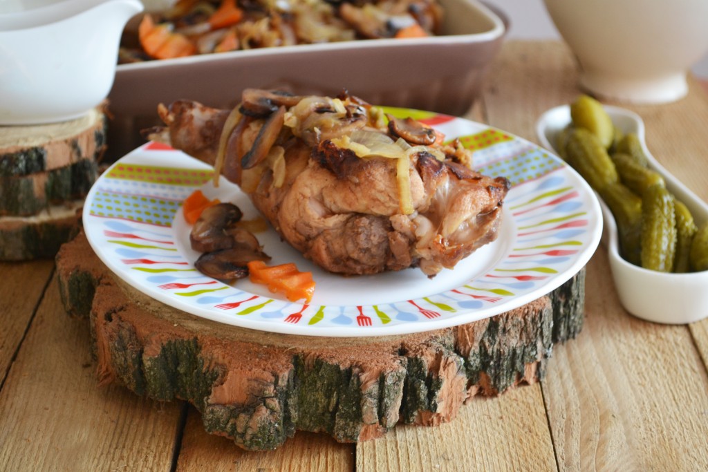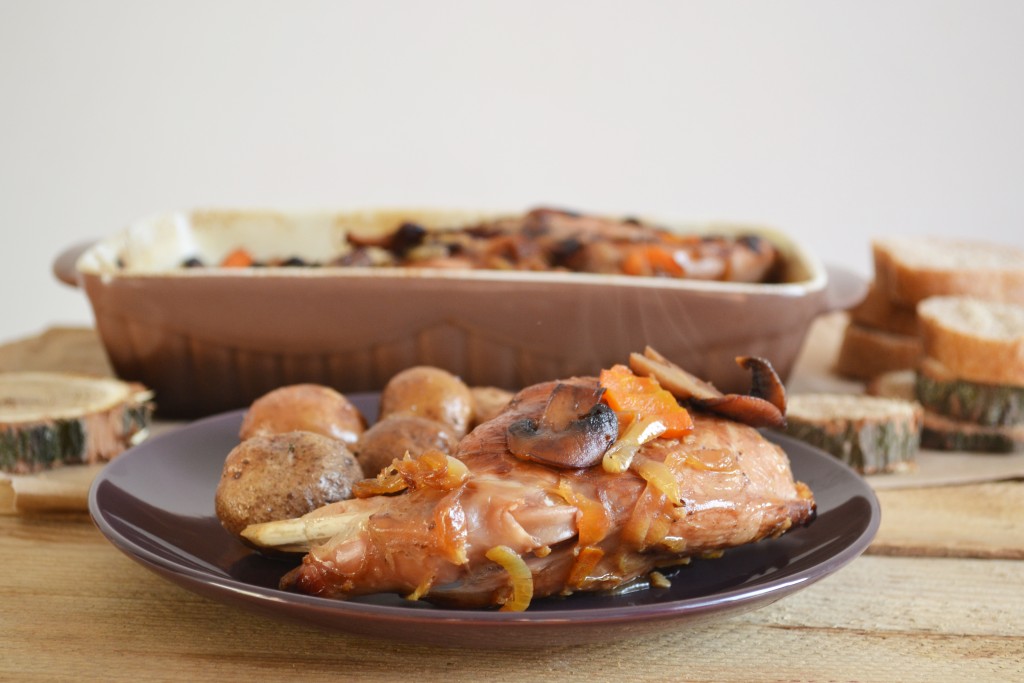 Сочное, вкусное мясо кролика с грибами достаём из духовки и подаём к столу в горячем виде.