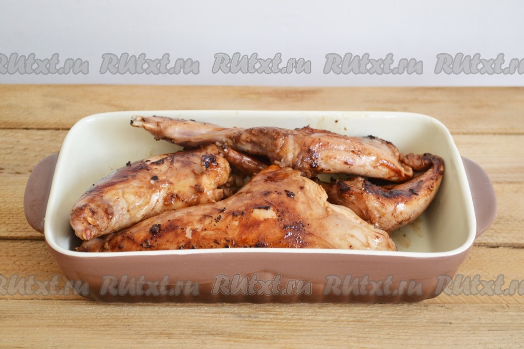 Замаринованные кусочки кролика обжариваем на хорошо разогретой сковороде с небольшим количеством масла с двух сторон (примерно по 2-3 минуты с каждой стороны). Должна образоваться поджаристая, красивая корочка.