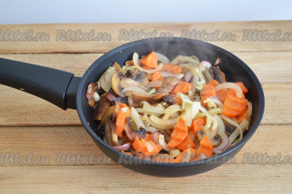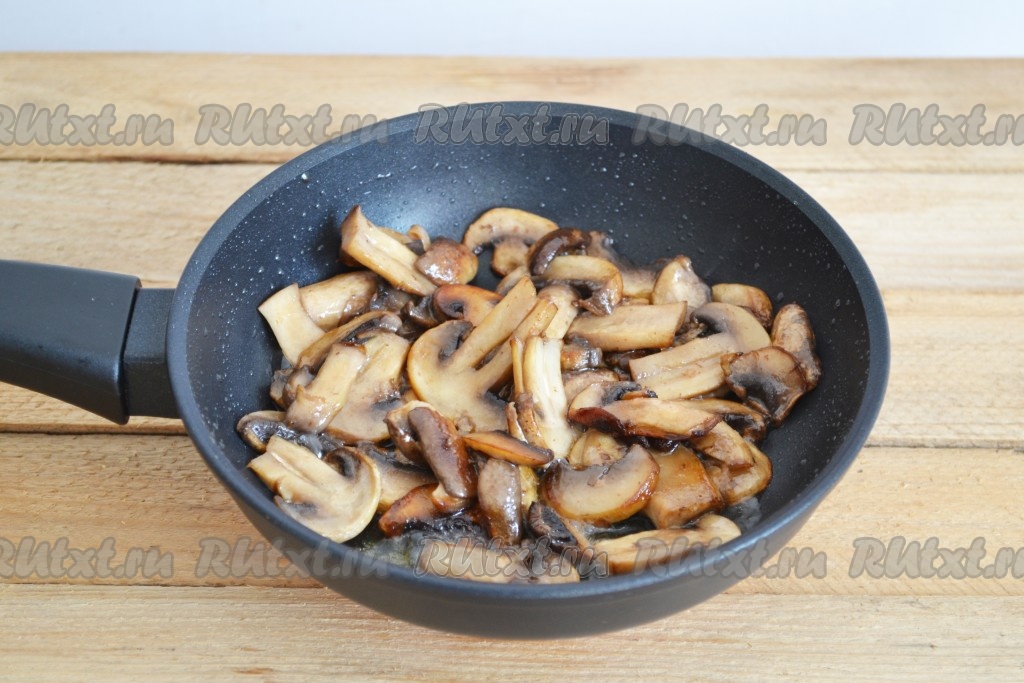 Шампиньоны нарезаем на пластины и обжариваем на растительном масле до испарения жидкости из грибов. В процессе жарки шампиньоны должны приобрести красивый золотистый цвет.