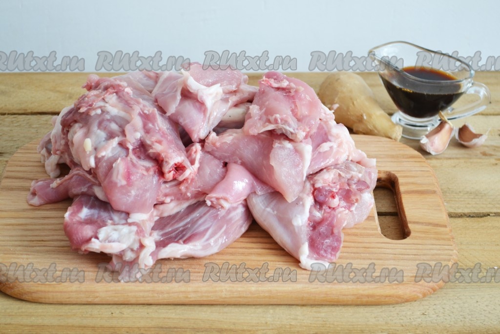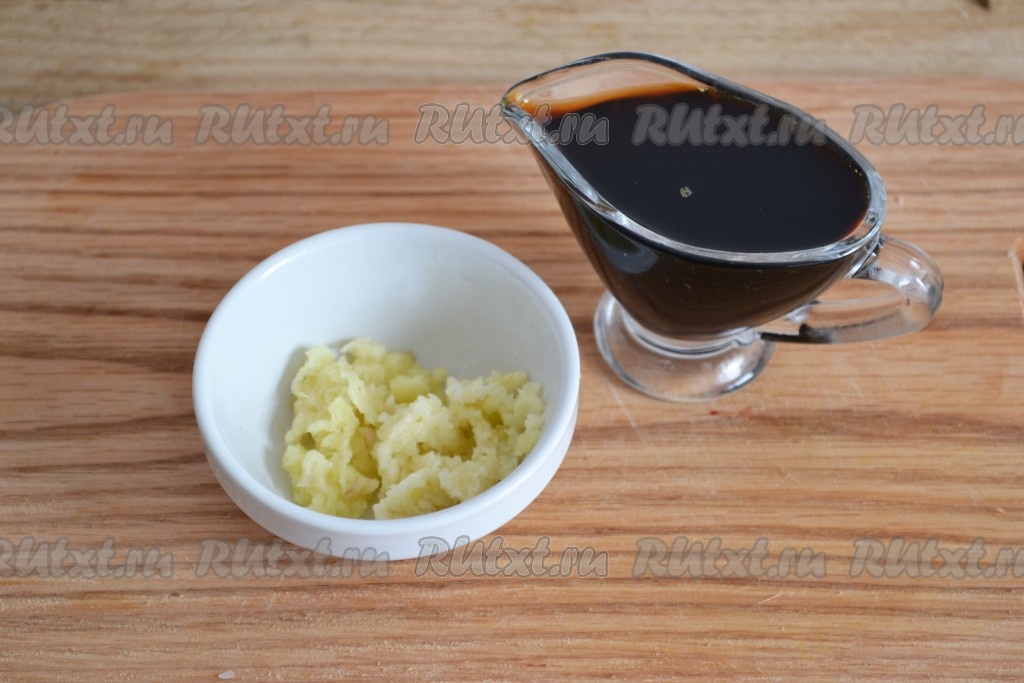 Добавляем к кусочкам кролика измельченный чеснок вместе с соевым соусом, перемешиваем и оставляем на 30 минут. Затем солим (только не пересолите, так как соевый соус достаточно соленый).