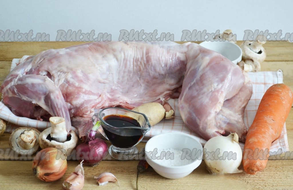 Подготовим все необходимые ингредиенты для приготовления кролика с грибами в духовке.
