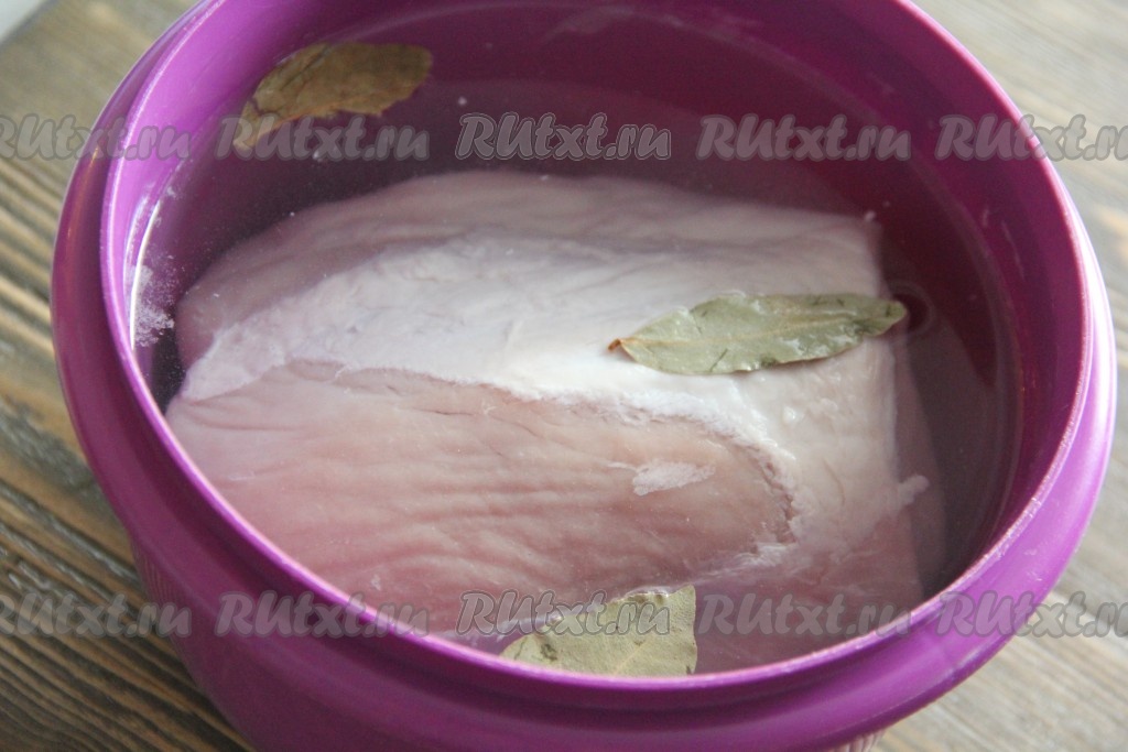 Опустить свинину в солевой раствор и оставить в рассоле на 3-4 часа, можно на ночь.