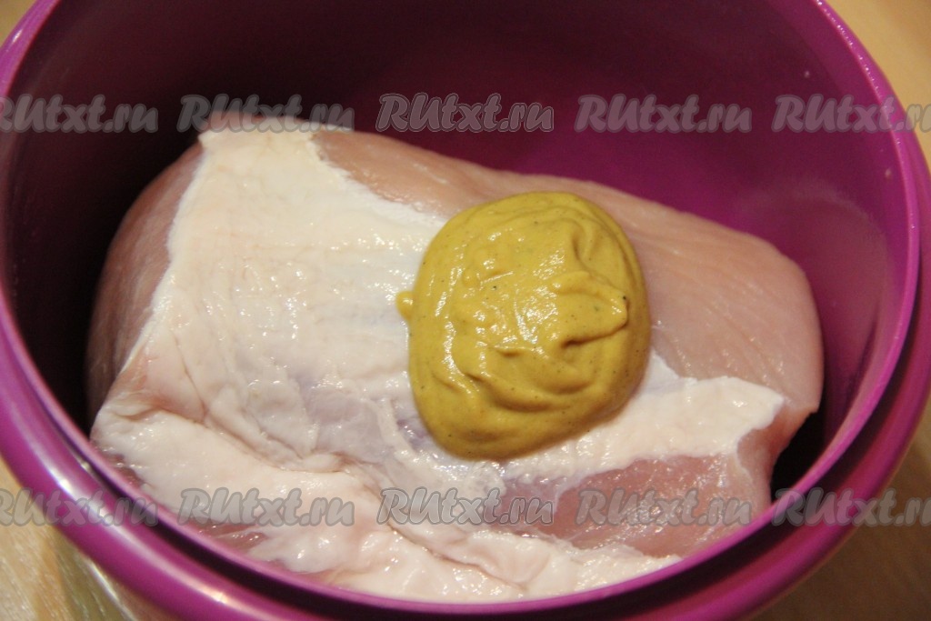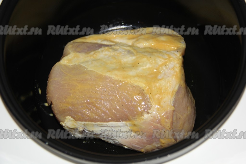Хорошо обмазать свинину горчицей и выложить в чашу мультиварки. Добавить немного растительного масла.
