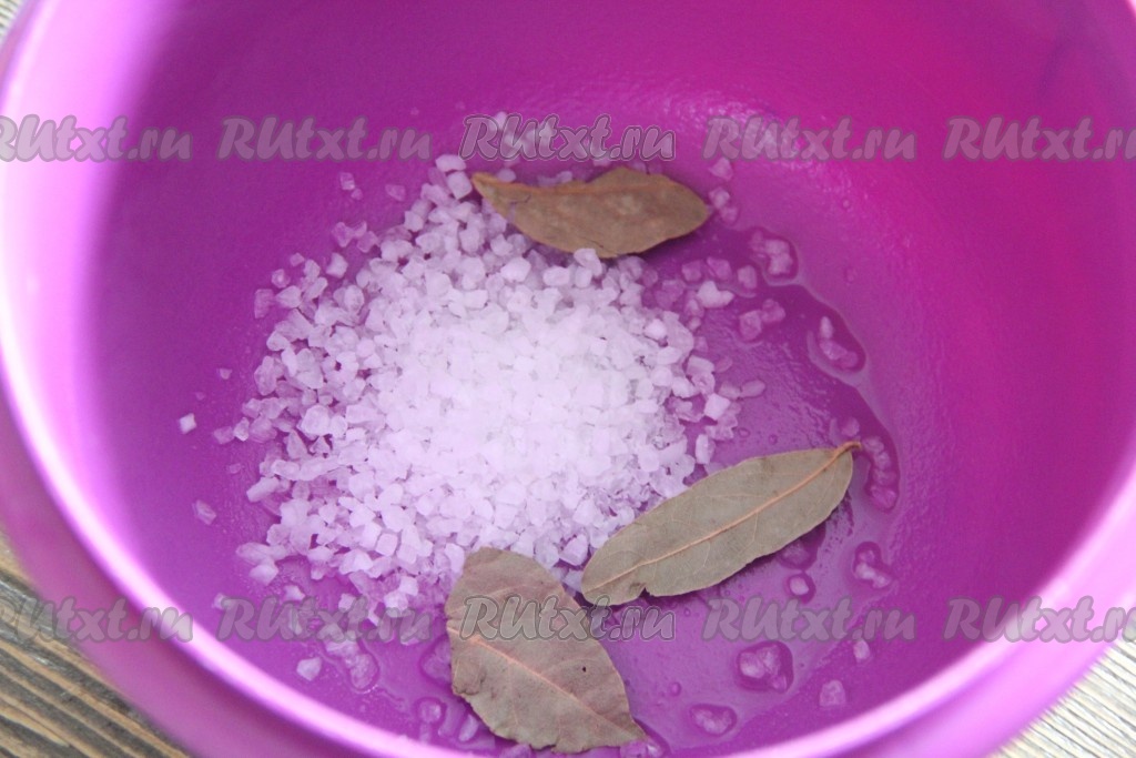 Для начала приготовить маринад для мяса. В глубокую миску всыпать соль и добавить лавровый лист. Соль я использую морскую, крупную.