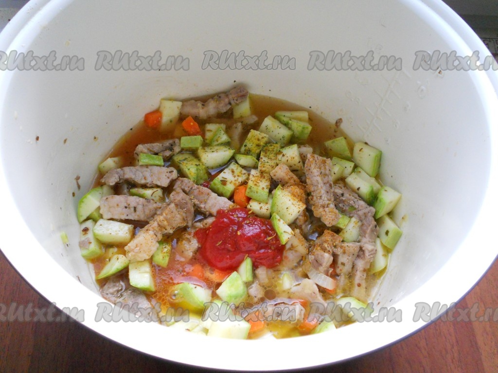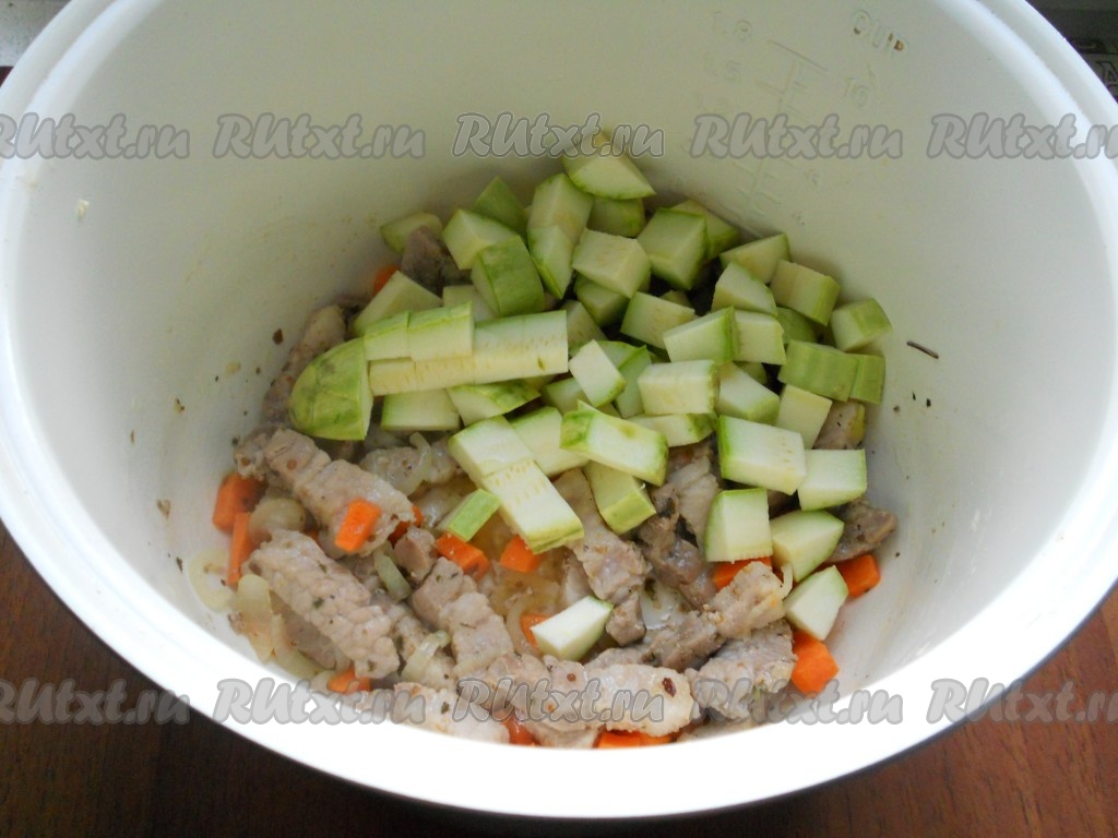 Также добавить морковь, нарезанную кубиками. Продолжать готовить на том же режиме еще 5 минут с открытой крышкой, иногда перемешивая. Затем добавить в чашу нарезанные средними кубиками кабачки.