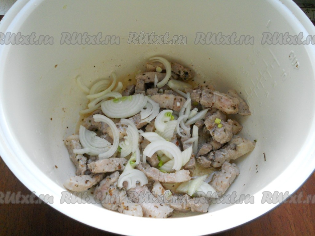 В чашу мультиварки влить растительное масло, выставить программу "Выпечка" на 45 минут. Через 5 минут разогрева выложить в чашу мясо. Посолить, посыпать специями для мяса. Готовить далее при открытой крышке, периодически перемешивая мясо. Через 10 минут добавить к мясу нарезанный репчатый лук, перемешать.
