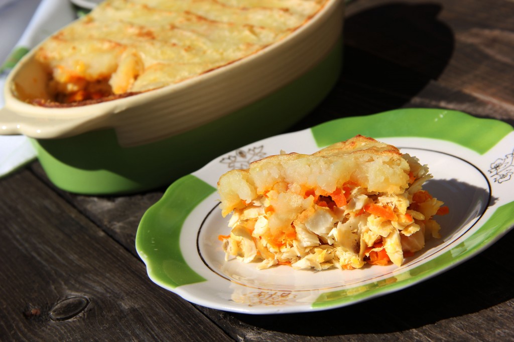 Поверх рыбы выложить слой из картофельного пюре и пару кусочков сливочного масла. Отправить запеканку в разогретую до 200 градусов духовку примерно на 25-30 минут и готовить до золотистого цвета.