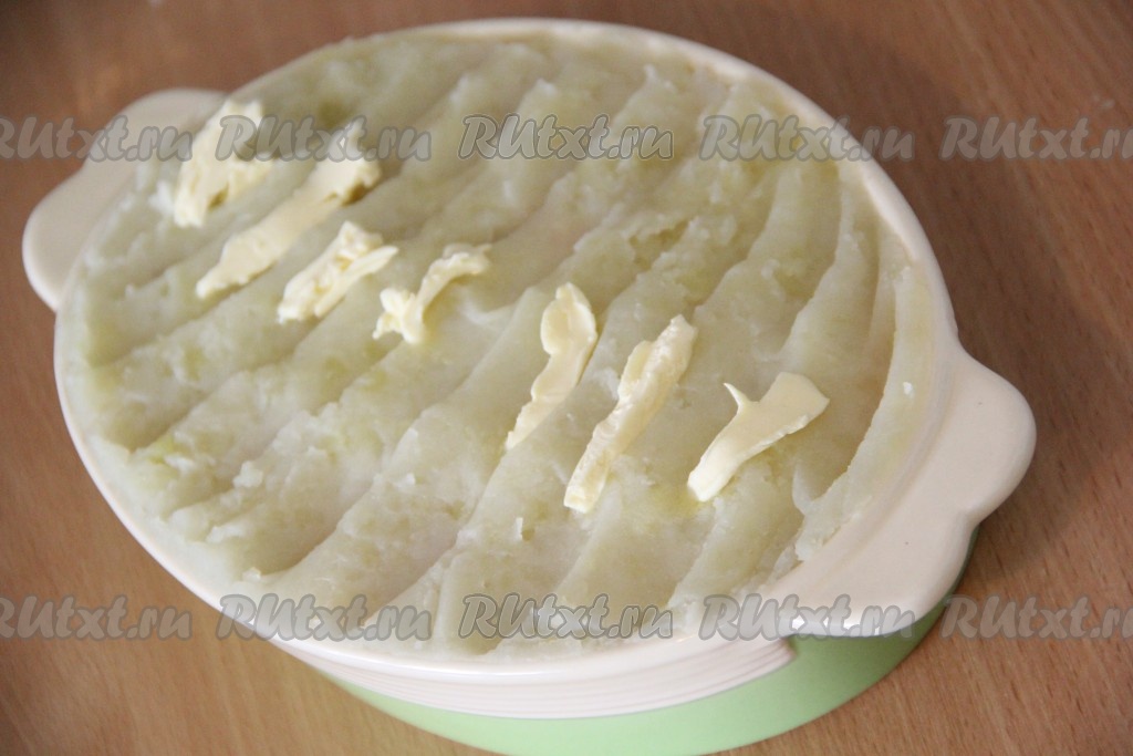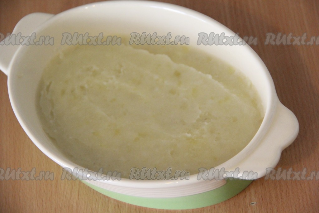 Форму для выпекания смазать сливочным маслом. Выложить на дно формы слой картофельного пюре.