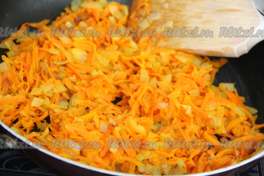 Добавить морковку на сковороду к луку и обжарить овощи вместе в течение 5 минут, не забывая иногда перемешивать.