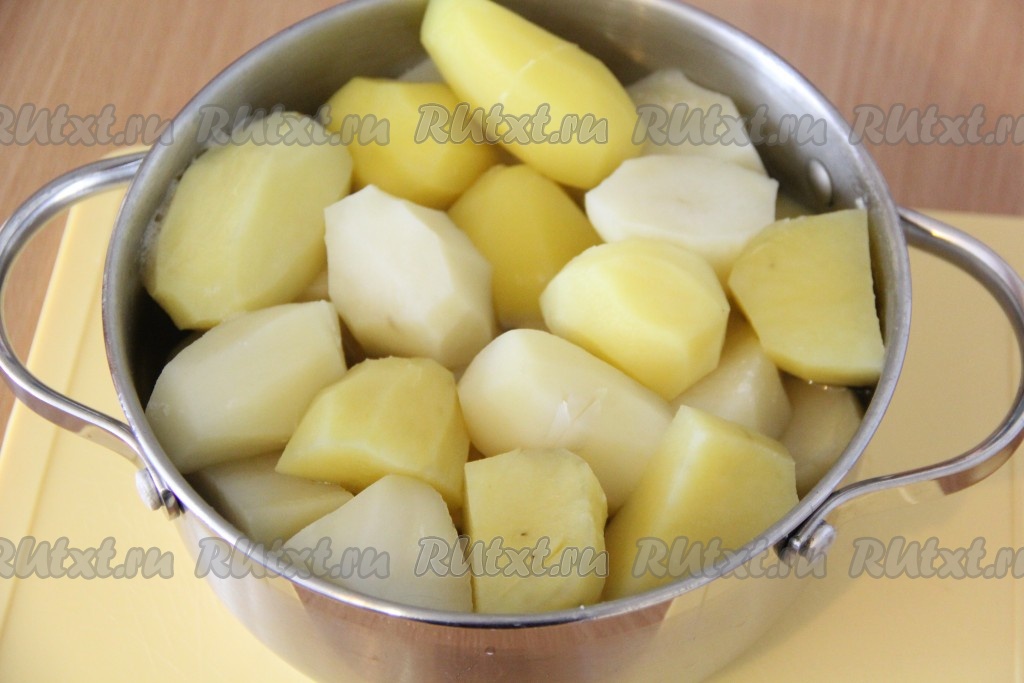 Картофель очистить, залить холодной водой, посолить и поставить на огонь. Сварить картошку до готовности. Измельчить картофель в пюре. Кстати, для запеканки можно использовать картофельное пюре, оставшееся после ужина.