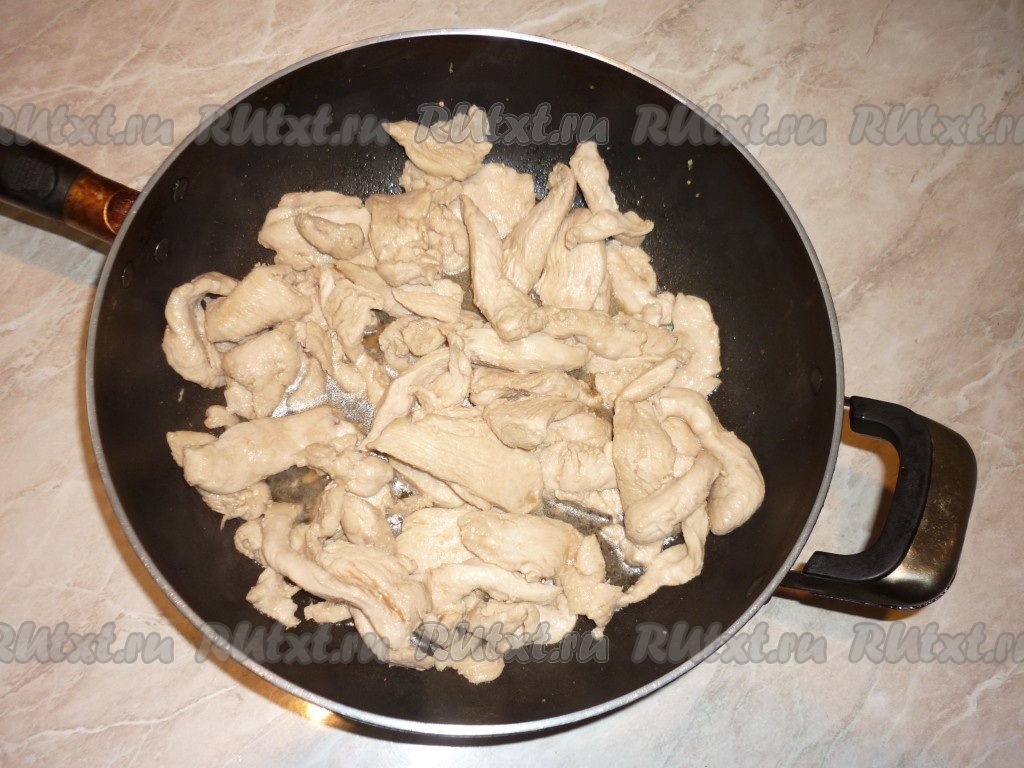 На хорошо разогретую сковороду с растительным маслом выложить куриное филе, замаринованное в соевом соусе, и, помешивая, обжарить в течение 5 минут.