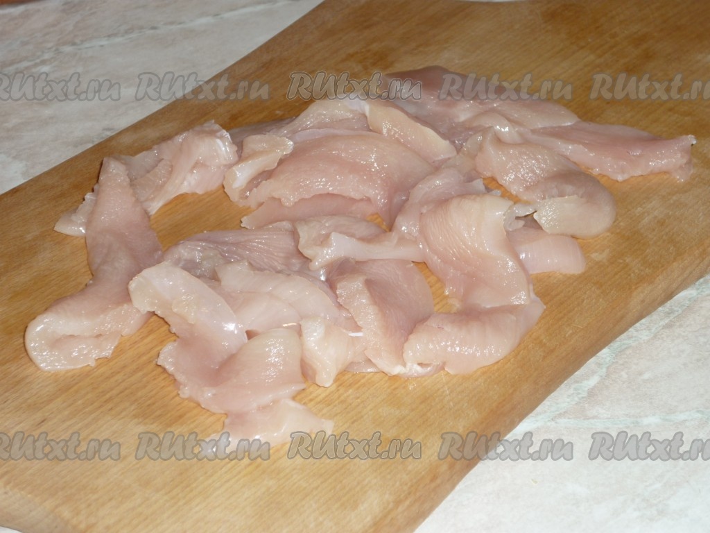 Куриное филе вымыть холодной водой, обсушить и нарезать длинными, достаточно тонкими полосками.