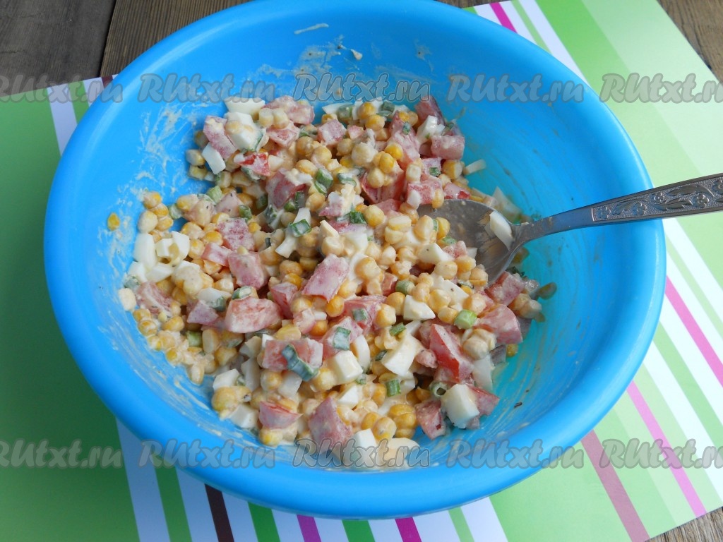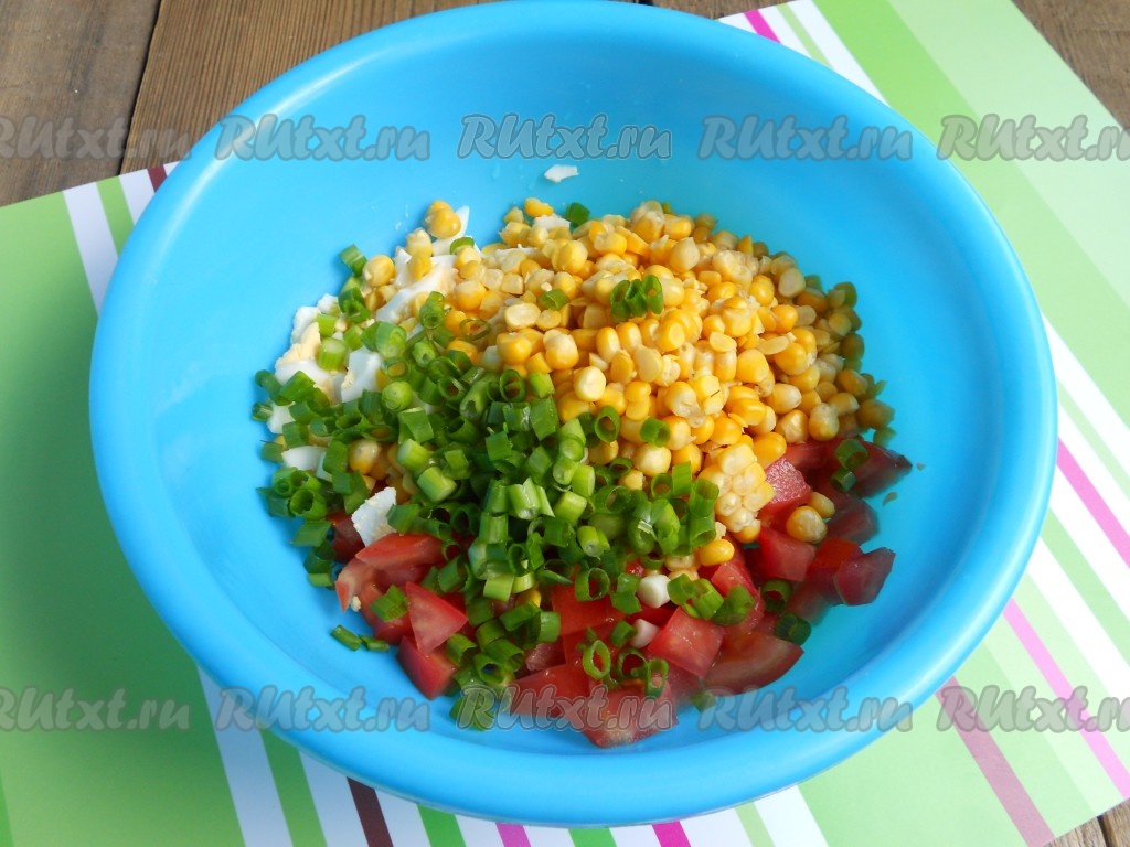 Добавить в салат к яйцам и помидорам измельченный зеленый лук и консервированную кукурузу.