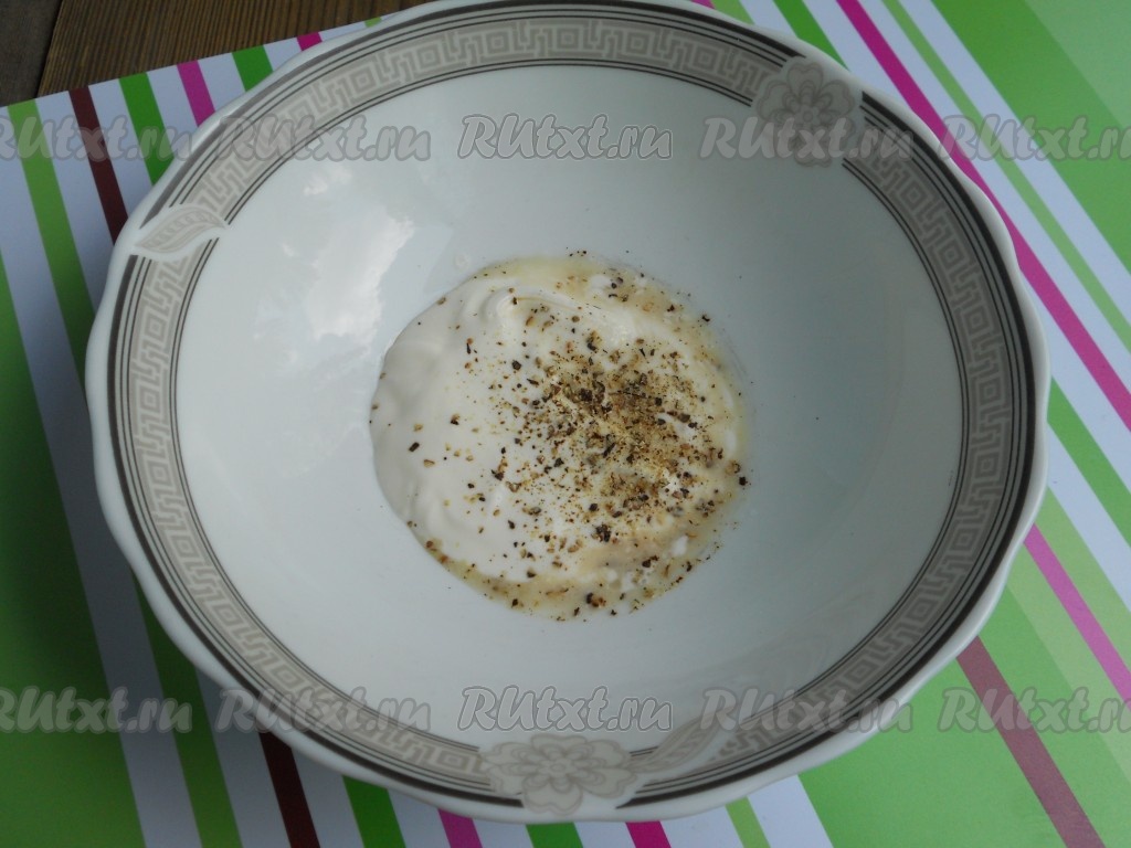 Для приготовления заправки в сметану влить лимонный сок, посолить, поперчить, добавить щепотку сахара и перемешать.