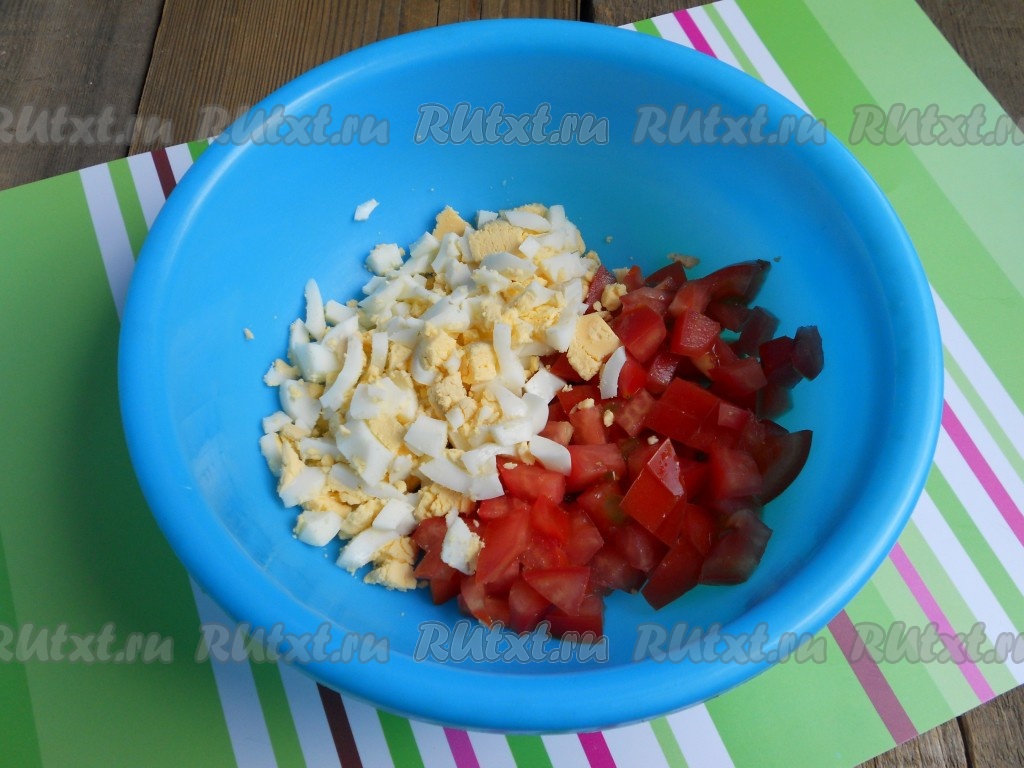 Яйца отварить вкрутую, остудить и очистить. Помидоры нарезать небольшими кубиками (обязательно нужны твердые помидоры), яйца порубить.