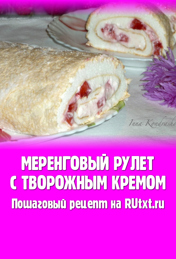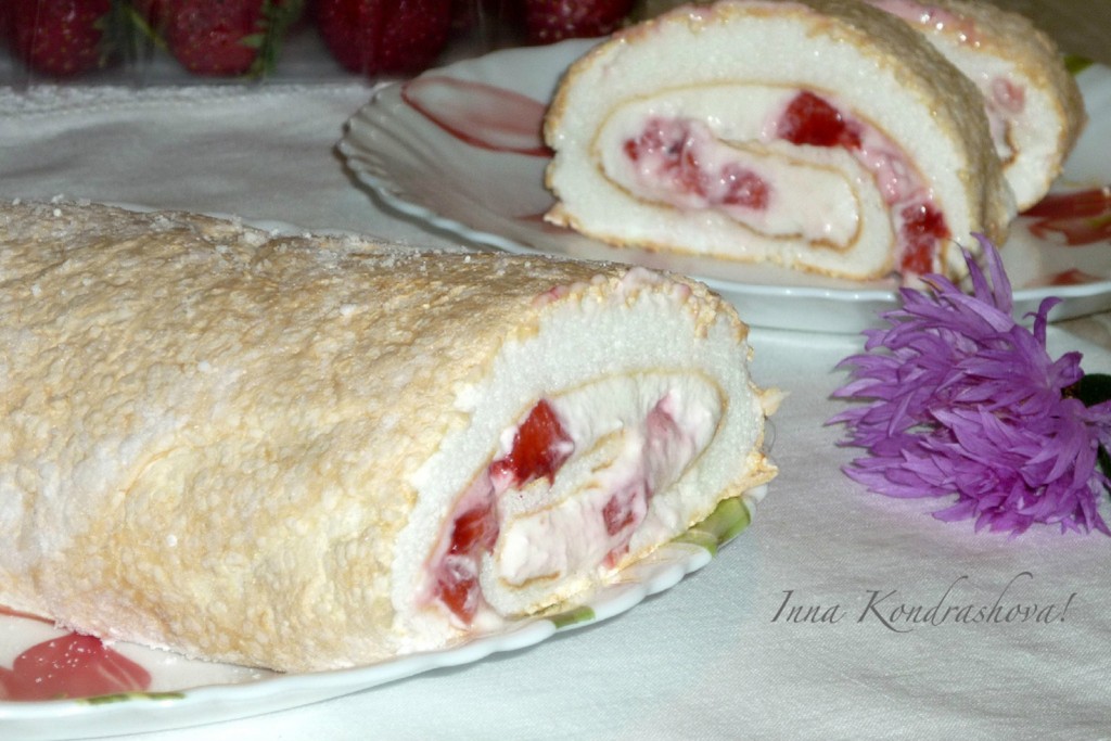Вкусный, нежный, изысканный меренговый рулет с творожным кремом не оставит равнодушным никого. Готовится этот воздушный десерт достаточно просто. В начинку я добавила клубнику, она сделала и разрез, и вкус рулета ещё более интересным. Но при желании клубнику можно заменить на банан, персик, абрикос, вишню или вовсе не добавлять. Приготовьте воздушный рулет по этому рецепту и насладитесь его восхитительным вкусом!