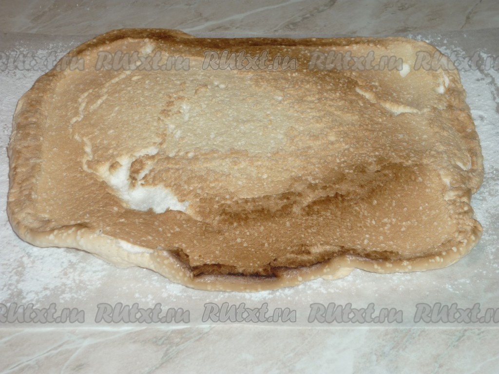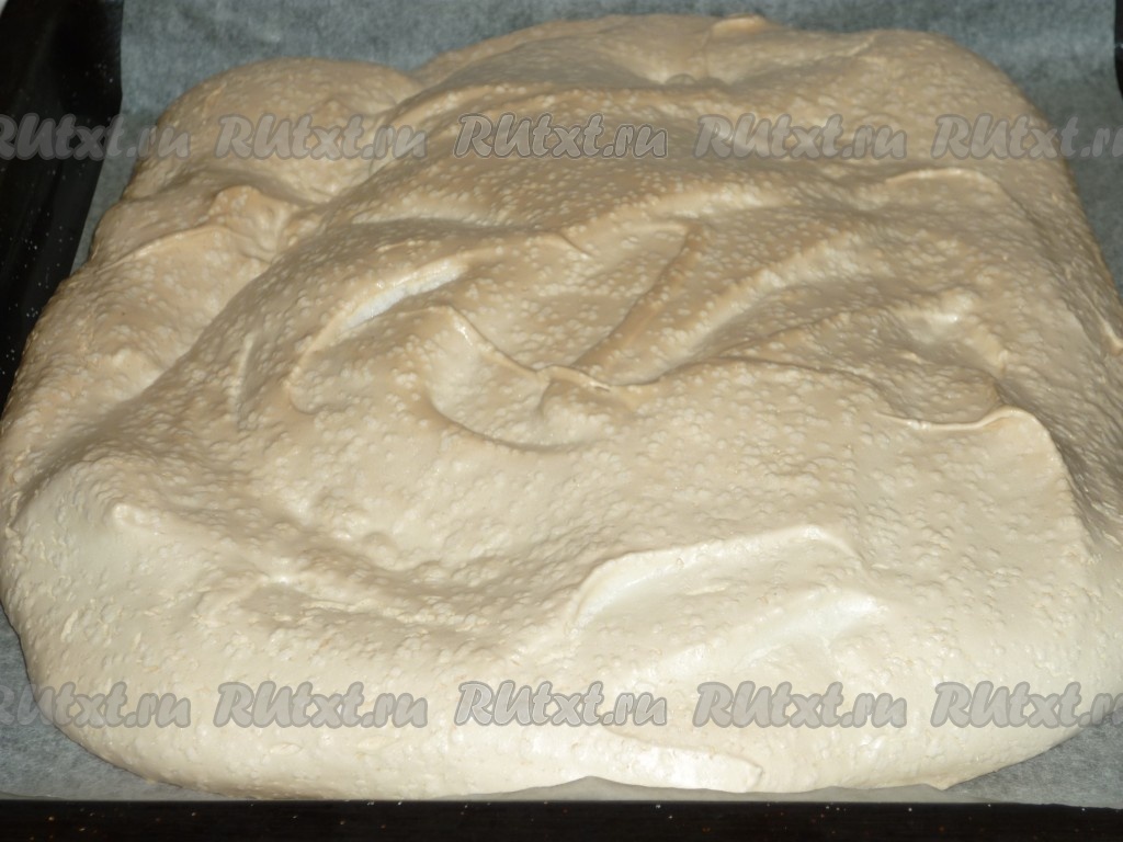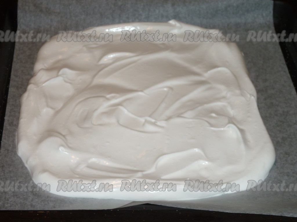 Выложить белковую массу на застеленный пергамент, разровнять, формируя прямоугольник толщиной 2-2,5 сантиметра. Отправить противень в уже разогретую духовку.