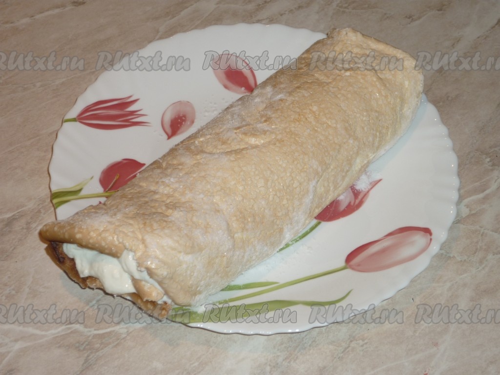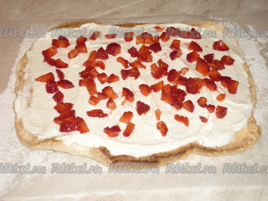 Свернуть меренговый корж, смазанный творожным кремом, начиная с широкой стороны с помощью пергамента, в рулет.