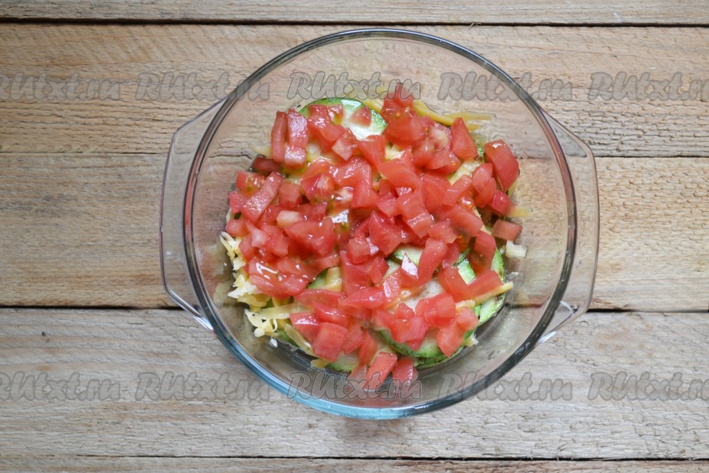 Помидоры нарезаем на мелкие кубики, выкладываем половину помидоров следующим слоем. Далее опять кладём слой кабачков, посыпаем частью натёртого сыра, выкладываем кабачки и оставшиеся помидоры.