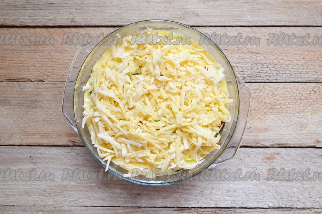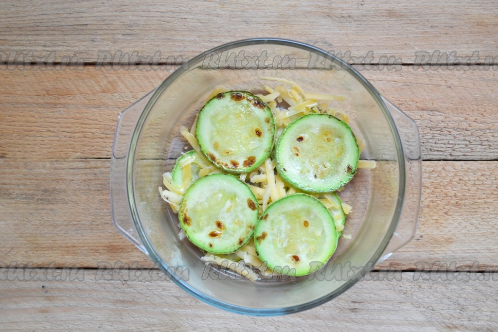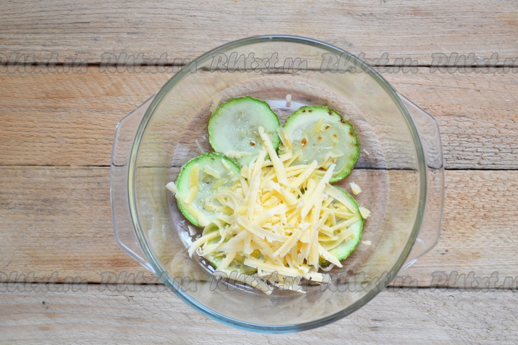 Сыр натираем на крупной тёрке. Форму для запекания, по желанию, смазываем маслом (я не смазывала). Выкладываем часть кабачков в один слой в форму для запекания, посыпаем частью натёртого сыра.