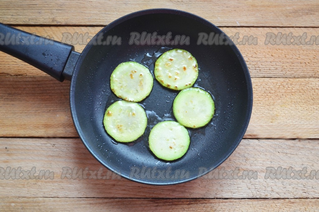 На сковороде разогреваем растительное масло, выкладываем в один слой кружочки кабачка. Обжариваем на среднем огне до подрумянивания с двух сторон. Обжаренные кабачки перекладываем на тарелку. Постепенно жарим все кабачки, добавляя в сковороду масло по мере необходимости. Даём жареным кабачкам остыть.