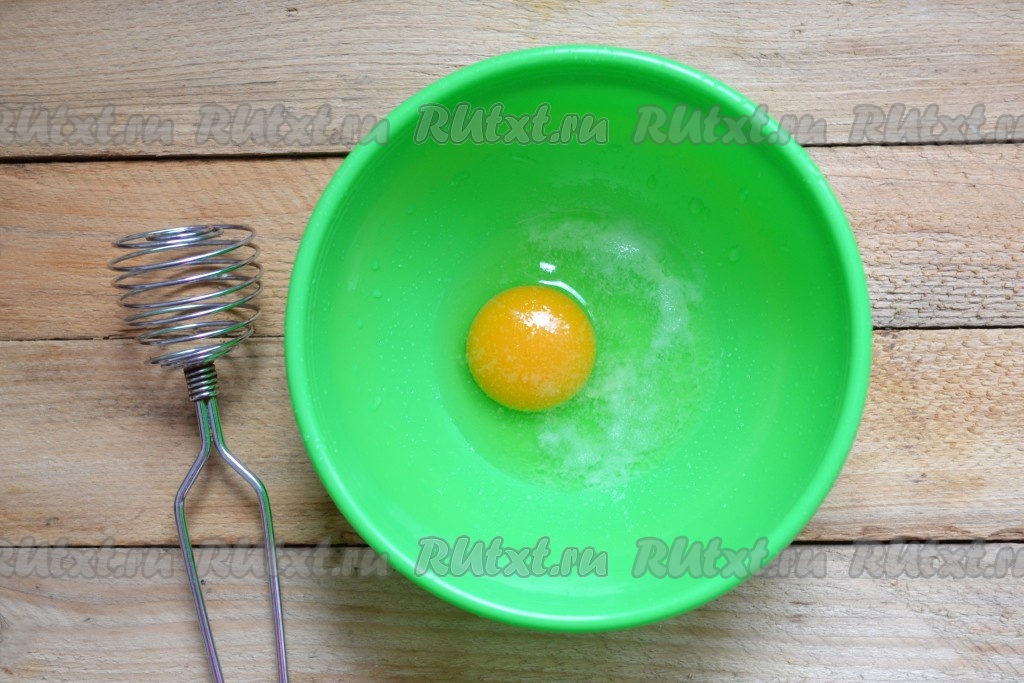 Готовим молочно-яичную заливку, для этого в миску вбиваем крупное сырое яйцо (или 2 средних яйца), добавляем щепотку соли.